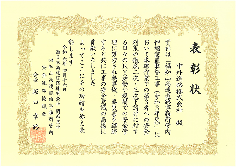 西日本高速道路株式会社 関西支社 福知山高速道路事務所管内 安全連絡協議会より「優良事業者表彰」を受けました。
