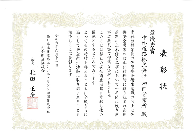 西日本高速道路エンジニアリング四国株式会社 安全衛生協議会より「10年間におよぶ事故無災害達成の表彰」を受けました。