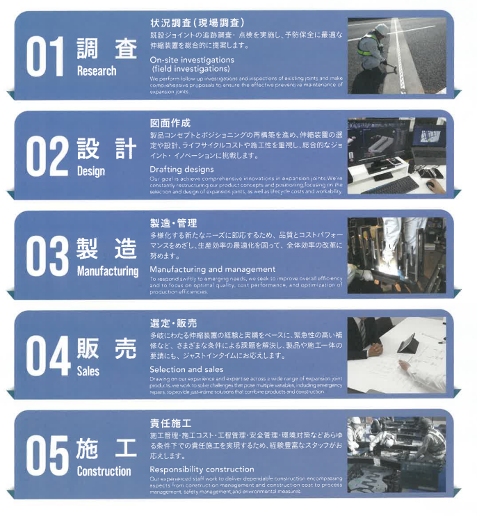 高架・橋梁用ジョイント一筋の中外道路は創業以来、 調査・設計・製造・販売・施工に至るまで一貫した総合力を発揮してきました。 これからもライフサイクルコストを念頭に、 ミニマムメンテナンスを追求し、 ジョイント専門メーカーとして、担うべきイノベーションに向かって進みます。